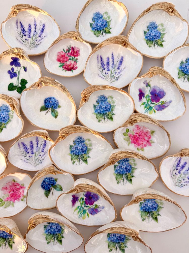 Handmade from recycled oyster and clam shells harvested from Duxbury Bay. Each shell is scrubbed, bleached, primed, decoupaged and edged in gold paint.